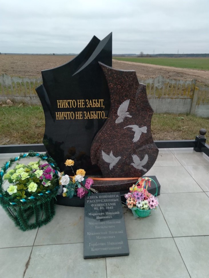 Имеется надпись: «Здесь лежат расстрелянные фашистами в 1943 году МАРКЕВИЧ Н.И., МАРКЕВИЧ Н.В., КОЗЛОВСКИЙ В.М., ГОРБАТЧИК Н.К.».