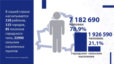 По состоянию на 1 января 2025 г. в Республике Беларусь проживало 7 182 690 городского населения (78,9 %) и 1 926 590 – сельского (21,1 %).
