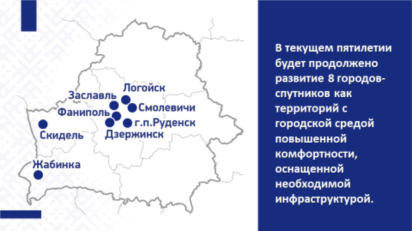 В 2026–2030 гг. будет продолжено развитие 8 городов-спутников в Брестской (г. Жабинка), Гродненской (г. Скидель), Минской (города Дзержинск, Заславль, Логойск, Смолевичи, Фаниполь, г.п. Руденск) областях как территорий с городской средой повышенной комфортности, оснащенных необходимой инфраструктурой.