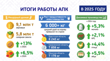 В 2025 году аграрии страны достигли рекордной отметки в 9,1 млн т собранных зерновых, 5,8 млн т свеклы сахарной, положительные результаты получены по сбору картофеля (113,0 % к 2024 году) и овощей (106,5 % соответственно).