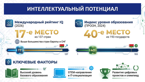 По данным International IQ Test 2026 года Беларусь вошла в двадцатку стран по уровню интеллекта и заняла 17‑е место в мировом рейтинге из 137 стран. Беларусь обошла большинство стран Европы и СНГ.Аналитики связывают это с традиционно высоким уровнем базового образования, широким охватом школьников естественно‑научными дисциплинами и растущим интересом молодежи к IT‑специальностям. В последние годы в стране активно развиваются STEM‑направления, инженерные олимпиады и цифровые образовательные проекты.