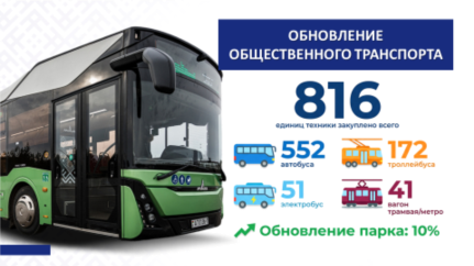 Развивается транспортное сообщение. Организациями транспорта общего пользования осуществляется обновление подвижного состава. Только в 2025 году во всех регионах республики закуплено 816 единиц городской пассажирской техники: 552 автобуса, 172 троллейбуса, 51 электробус, 41 единица вагонов трамваев и метро. В целом по республике процент обновления подвижного состава городского общественного транспорта в 2026–2030 гг. прогнозируется ежегодно около 10 %.