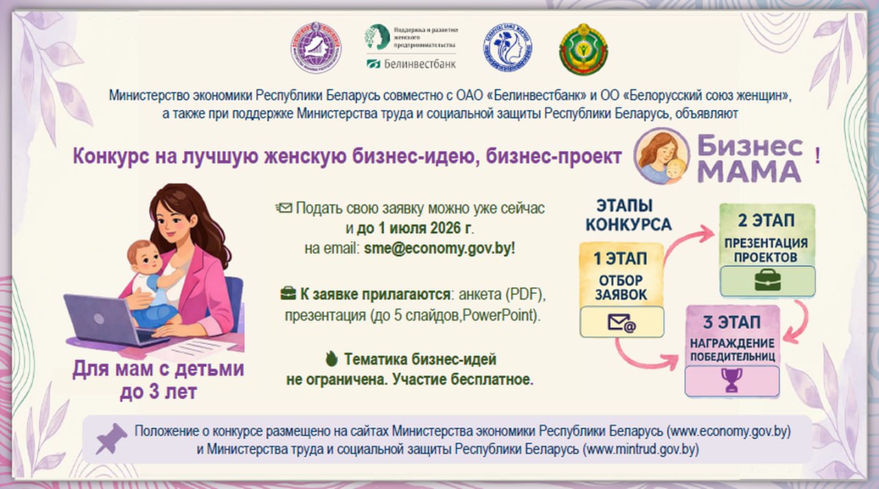 Министерство экономики совместно с Белорусским союзом женщин и ОАО «Белинвестбанк» при поддержке Министерства труда и социальной защиты объявляет о старте конкурса на лучшую бизнес-идею, бизнес-проект «БизнесМАМА».