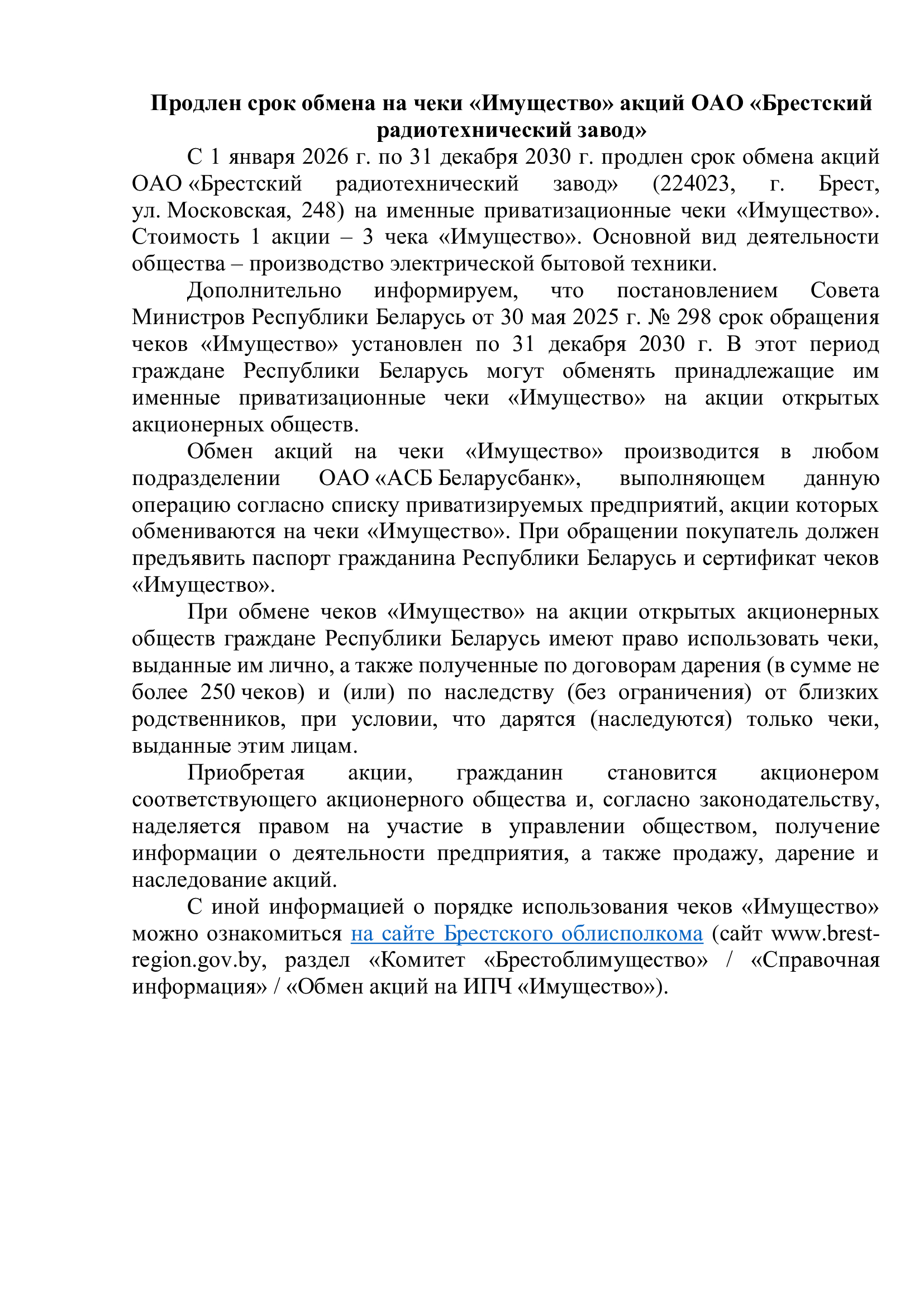 Продлен срок обмена на чеки "Имущество"акций ОАО "Брестский радиотехнический завод"