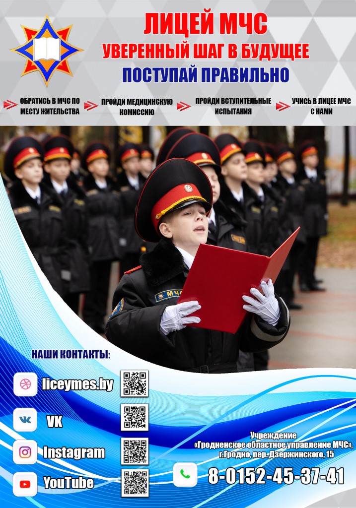 Для получения более подробной информации Вам необходимо обратиться в Ивановский районный отдел по чрезвычайным ситуациям (г. Иваново, ул. К.Маркса, 39, тел. 9-22-06, + 375 (33) 650-78-91; тел.101), где Вам предоставят исчерпывающую информацию о правилах приема в Университет и Лицей, либо посетить официальные сайты Университета http://ucp.by (раздел «Абитуриенту») и Лицея liceymes.by.