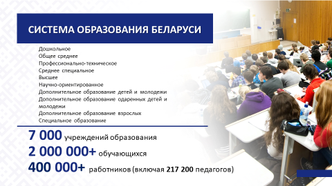 Выбор курса на создание социального государства позволил определить верную стратегию функционирования и развития системы образования Республики Беларусь. Об этом свидетельствуют такие макропоказатели по данным переписи населения 2019 года, как уровень грамотности взрослого населения (99,9 %), охват общим базовым, общим средним, профессионально-техническим, средним специальным, высшим и научно-ориентированным образованием занятого населения (99,6 %).