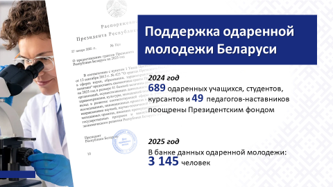 Особое внимание уделяется государственной поддержке одаренных учащихся и студентов. Действует специальный фонд Президента Республики Беларусь по социальной поддержке одаренных учащихся и студентов, из средств которого 17 июля 2025 г. назначены очередные стипенд 192 студентам УВО назначены стипендии Президента. Гранд-премий с присвоением звания лауреата специального фонда удостоены 28 победителей международных олимпиад и конкурсов.