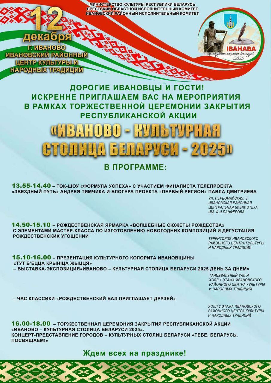Программа мероприятий в рамках торжественной церемонии закрытия республиканской акции "Иваново - культурная столица Беларуси - 2025"